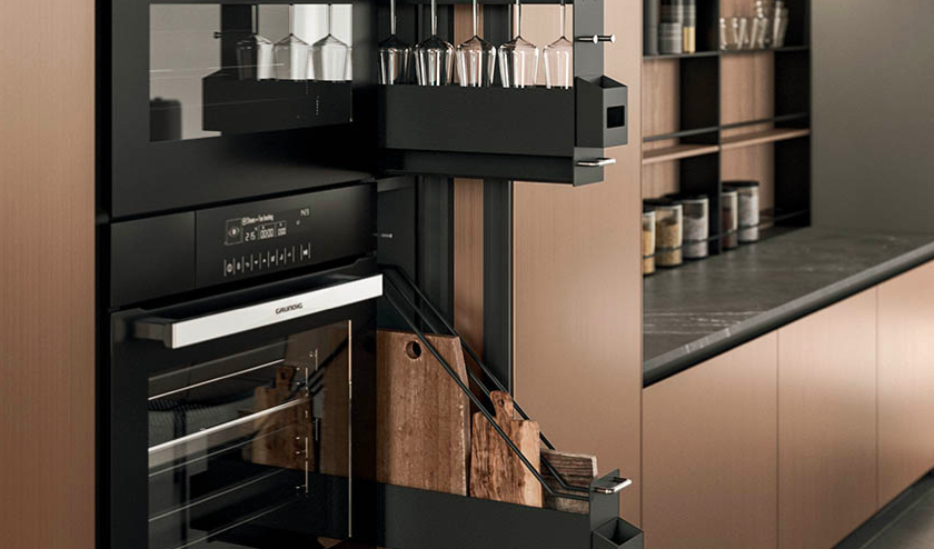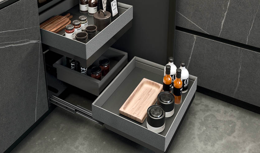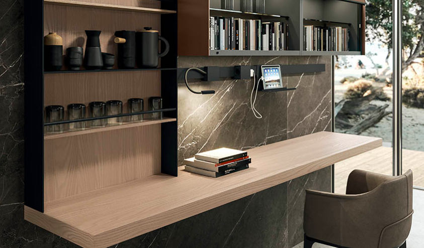 Ak_04 is also enriched by a series of accessories: the Toah table which comes in 18 stoneware finishes on glass support, the suspended countertops with hidden supports and the new Fly Box accessory for easier access to corner units.